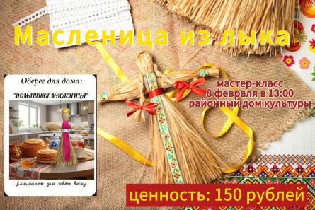 В преддверии праздника «Масленица» в районном доме культуры пройдёт мастер-класс, на котором научат делать красавицу — Масленицу, оберег для дома из природного материала лыка.